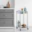 Der moderne Servierwagen rund in Silber ist der perfekte Begleiter für Ihre nächste Veranstaltung. Mit zwei Ablagen bietet er ausreichend Platz für Speisen und Getränke. Die verspiegelten Ablageflächen und das Stahlgestell in Chrom-Optik verleihen ihm einen eleganten Look. Dank der vier Kugelrollen lässt sich der Wagen mühelos bewegen, während der praktische Rand der oberen Ablage für Sicherheit sorgt.