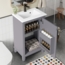 Dieser freistehende Badezimmerschrank in Grau vereint modernes Design mit praktischen Funktionen. Mit den Abmessungen 51 x 34 x 83 cm bietet er ausreichend Stauraum hinter einer eleganten Tür. Das integrierte, zentrale Keramikwaschbecken ist nicht nur stilvoll, sondern auch pflegeleicht. Verstellbare Regale und feuchtigkeitsbeständige Eigenschaften machen ihn ideal für kleine Badezimmer. Die Montage gestaltet sich unkompliziert und schnell.