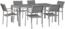 Essgruppe für 6 Personen GROSSETO in Stein Granit Optik. Der Tisch misst 180 x 90 x 76 cm und ist aus poliertem Granit gefertigt, während der stabile Rahmen aus gebürstetem Edelstahl besteht. Sechs designer Stühle mit UV-beständiger Textilsitzfläche in Grau runden das Set ab. Ideal für Garten und Terrasse, bietet dieses Set sowohl Robustheit als auch elegantes Design für stilvolle Momente im Freien.