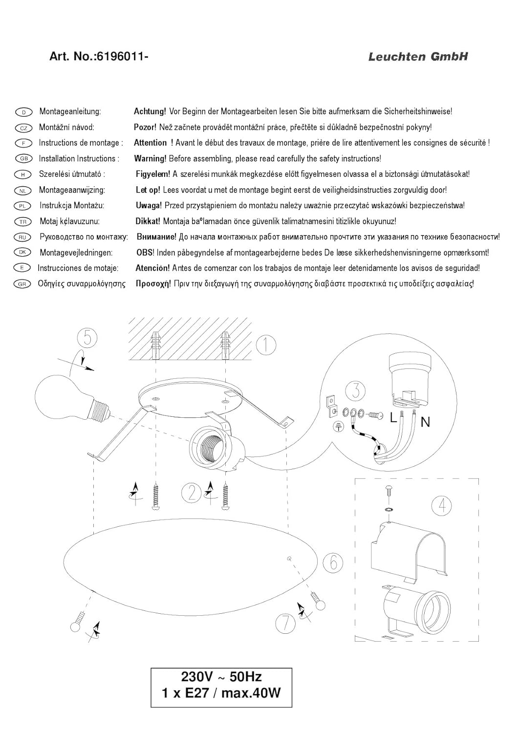 Metall Nickel matt Glas alabasterart weiß Abmessungen Ø 250, H 90 Technische Daten Nennleistung: 40 W Energieverbrauch in 1. 000 Stunden: 40 IP Schutzklasse: 20