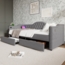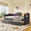 Dieses Polsterbett mit einer Liegefläche von 90x190 cm vereint elegantes Design und praktischen Stauraum. Der graue Leinenbezug und das getuftete Vintage-Kopfteil schaffen eine einladende Atmosphäre. Mit zwei großen Schubladen und integrierten USB- und Type-C-Anschlüssen ist es ideal für Kinderzimmer oder kleinere Wohnflächen. Die robuste Konstruktion aus Stahl, Massivholz und MDF sorgt für Stabilität und eine maximale Benutzerlast von 158 kg.