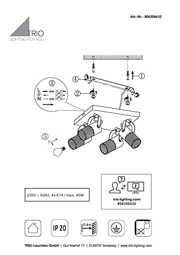Der moderne Mix aus Metall und Holz wirkt zeitlos und liegt absolut im Trend. Die Kombination mit Naturmaterialien ist aus modernen Wohnräumen nicht mehr wegzudenken und sorgt zudem für ein gemütliches Wohnambiente. Der 4er Spot TOSH ist also die ideale Wahl, um in Wohnräumen ein perfektes Lichtergebnis zu schaffen. Die einzelnen Spots können individuell ausgerichtet werden und eignen sich dadurch ebenfalls zur Ausleuchtung bestimmter Bereiche. Metall in Schwarz matt zusammen mit den Holzelementen findet sich in modernen und minimalistischen Einrichtungsstilen wieder. Für eine energiesparende Beleuchtung empfiehlt sich die Verwendung eines LED Leuchtmittels. Diese sind eine optimale Alternative zu herkömmlichen Halogen Leuchtmitteln und stehen für eine hohe Lichtqualität und eine Energieeinsparung von bis zu 80%. Zusätzlich profitieren Sie bei LED Leuchtmitteln von einer langen Lebensdauer, einer geringen Wärmeentwicklung und schonen gleichzeitig die Umwelt. Fassung: 4 x E14 Leistung: max. 15 W Dimmbar: ja, mit geeignetem Leuchtmittel Farbe: schwarz matt Material: Metall Maße: 22 x 19 x 22 cm (B x H x T)Schutzart: IP20 Schutzklasse: I Spannung: 230V Lieferumfang: Leuchte ohne Leuchmittel