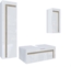 Das Badmöbel Komplettset Aloha V2 kombiniert modernes Design mit funktionalem Stauraum. Der Korpus in Weiß matt und die Fronten in Weiß Hochglanz mit Absetzungen in Eiche sägerau schaffen ein ansprechendes Ambiente. Das Set umfasst einen hängenden Waschbeckenunterschrank mit einer Klappe sowie zwei Hängeschränke, die reichlich Platz für Ihre Badezimmerutensilien bieten. Die hochwertige Verarbeitung und die pflegeleichten Materialien garantieren Langlebigkeit.