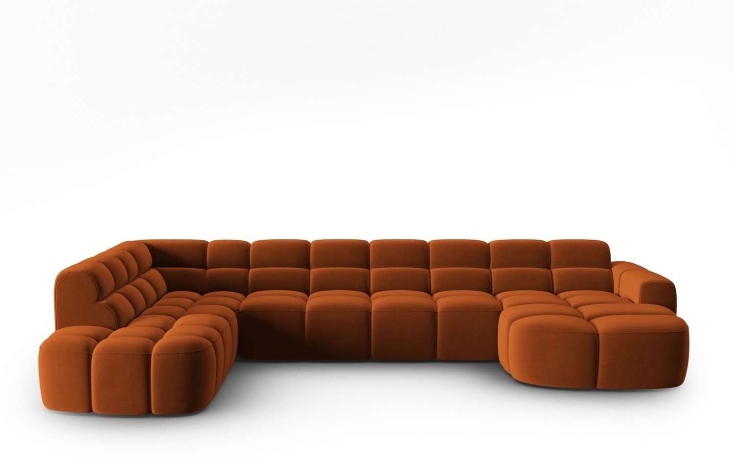 Micadoni Panorama Ecksofa Lisa 7-Sitzer Links Samt Casino Terrakotta - das perfekte Sofa für gesellige Abende oder entspannte Stunden allein. Mit einer Breite von 387 cm und einer Recamiere-Tiefe von 198 cm bietet es ausreichend Platz für Familie und Freunde. Der samtweiche Stoff und die robuste Verarbeitung mit 100.000 Scheuertouren sorgen für Langlebigkeit und Komfort. Die Taschenfedern und die hochelastische Polyurethan-Schaumstoff-Füllung (34 kg/m³) garantieren ein himmlisches Sitzgefühl.
