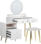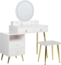 Schminktisch YVES in elegantem Weiß und Gold vereint Stil und Funktionalität. Mit einer breiten Tischplatte eignet er sich ideal zum Schminken, Lernen oder Arbeiten. Der runde LED-Spiegel mit 3 Farbtemperaturmodi sorgt für optimale Beleuchtung. Sechs geräumige Schubladen und ein offenes Regal bieten ausreichend Stauraum. Der stabile Polsterhocker ergänzt das Design perfekt, während der flexibel anbringbare Unterschrank für mehr Beinfreiheit sorgt.