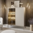 Die Vitrine dieser Kollektion zeichnet sich durch sorgfältig gefräste Fronten mit charakteristischen vertikalen Lamellen aus, die dem Möbelstück eine moderne und dynamische Note verleihen. Die Kombination aus matter Kaschmirfarbe und feinen champagnerfarbenen Akzenten unterstreicht das luxuriöse und elegante Erscheinungsbild der Vitrine. Die Türen bestehen aus hochwertiger MDF-Platte und gehärtetem Glas, was dem Möbel eine leichte und zugleich edle Ausstrahlung verleiht.