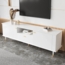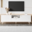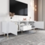 Eleganter TV-Ständer aus hochwertigem MDF in Weiß mit goldverzierten Füßen. Dieser stilvolle TV-Ständer vereint Eleganz und Funktionalität und bringt ein modernes Ambiente in Ihr Wohnzimmer. Mit praktischen Kabelöffnungen und Soft-Close-Scharniere sorgt er für Ordnung und ein geräuschloses Öffnen und Schließen. Der vielseitige Stauraum mit zwei Türen, einem offenen Fach und einer Schublade bietet Platz für TV-Zubehör, Bücher oder dekorative Elemente.