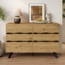 Dieses moderne Sideboard in Holzoptik vereint stilvolles Design mit praktischer Funktionalität. Mit den Abmessungen 120 x 40 x 75,5 cm und sechs großzügigen Schubladen bietet es vielseitigen Stauraum für verschiedene Gegenstände. Die wellenförmigen Fronten und stabilen schwarzen Metallfüße setzen elegante Akzente und sorgen für einen sicheren Stand. Ideal für Wohnzimmer, Esszimmer, Flur oder Schlafzimmer.
