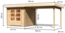 Seitliches Anbaudach naturbelassen mit 300 cm Breite über die gesamte Haustiefe, als Stauraum/Unterstand oder überdachter Sitzplatz. Hinten geschlossen mit 28 mm Rückwand, naturbelassen