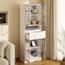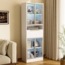 Moderner Hochschrank in elegantem Weiß mit 16-Farb-LED-Beleuchtung und Bluetooth-Funktion. Die Vitrine verfügt über eine Glasfront, vier Glastüren, eine offene Regalfläche und eine Schublade mit goldfarbenem Griff. Hergestellt aus MDF und Sicherheitsglas, bietet dieser Schrank vielseitige Aufbewahrungsmöglichkeiten und fügt sich harmonisch in jedes Wohnkonzept ein.