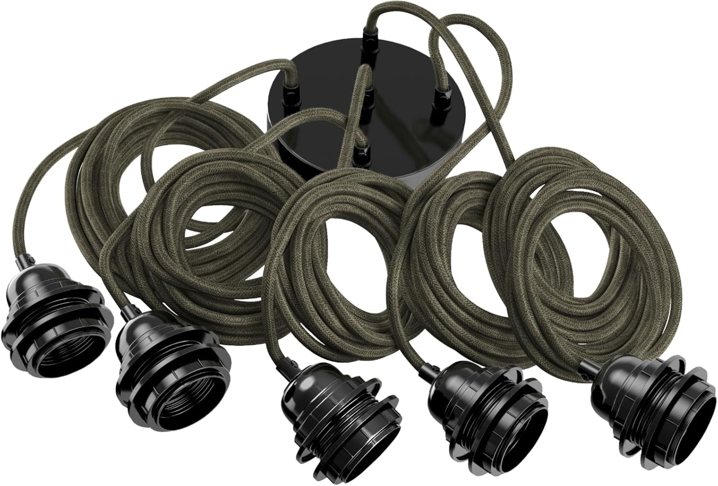 HOOPZI - Pendelleuchte - Hang 5 Flammig - 3,5m Textilkabel Seil - 5 X E27 Fassung - Vintage Retro kaki