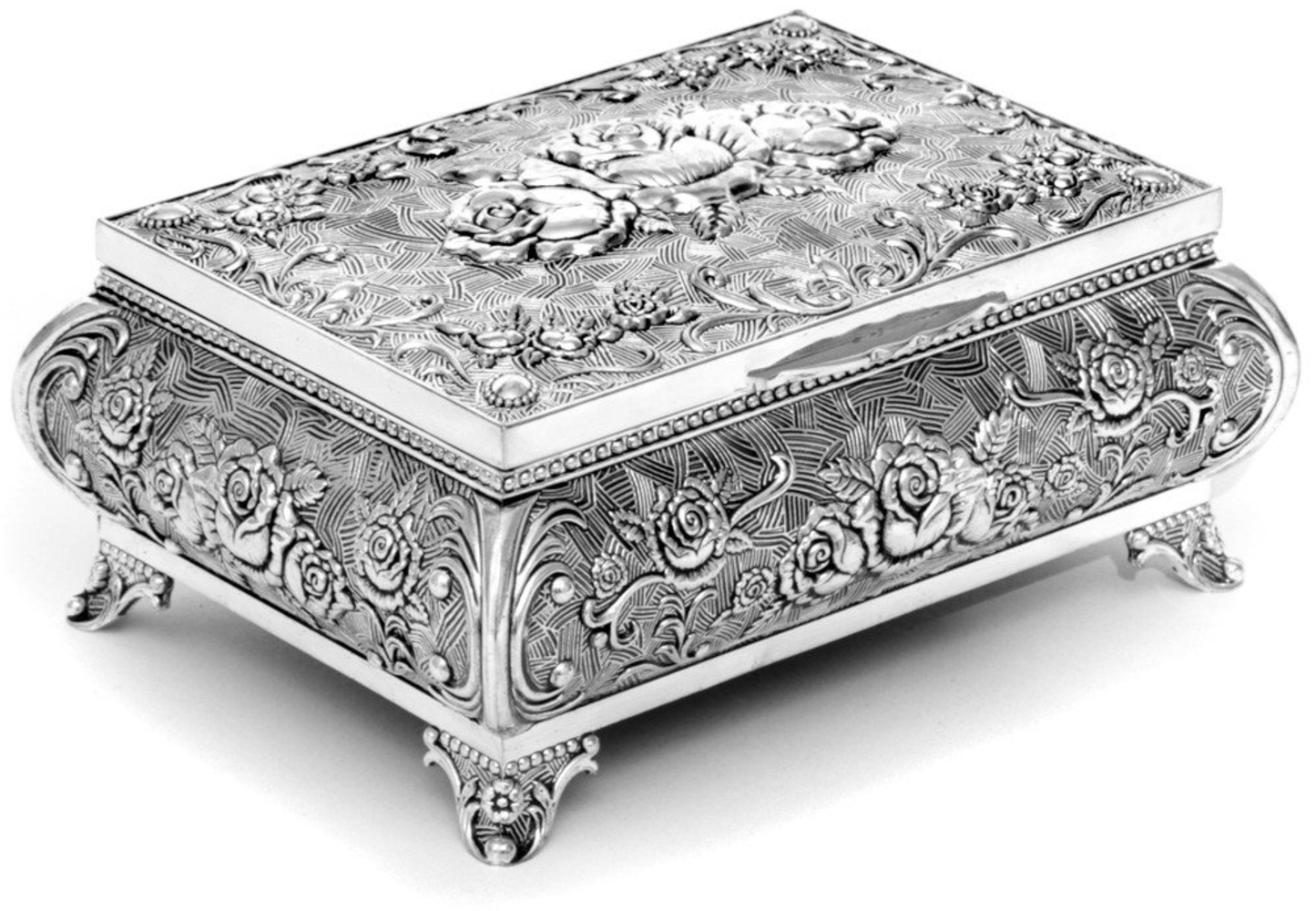 Die Schmuckschatulle Rose versilbert vereint edles Design und hochwertige Verarbeitung. Gefertigt aus Metall und im Antik-Look gehalten, bietet sie ein wunderschönes Zuhause für Ihren Schmuck. Das Innere sowie die Unterseite sind mit edlem Samt ausgekleidet, was die Exklusivität dieser Schmuckbox unterstreicht. Mit ihren filigranen Verzierungen und den kleinen Füßchen ist sie ein echter Blickfang.