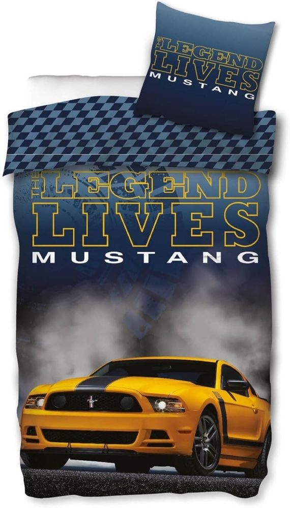 SkyBrands Bettwäsche Ford Mustang - Wende-Bettwäsche-Set, 135x200 cm & 80x80 cm, 100% Baumwolle. Dieses lizenziertes Bettwäsche-Set im Ford Mustang-Design vereint hohen Komfort und stilvolle Motive. Die atmungsaktive Bettwäsche aus temperaturausgleichender Baumwolle in Renforcé-Qualität ist ideal für Fans der Kultmarke und sorgt für eine erholsame Nachtruhe.