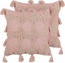 Modernes, strukturiertes Zierkissen 2er Set TORENIA in Rosa mit geometrischem Muster und Quasten. Hochwertige Baumwolle im Boho-Stil sorgt für eine gemütliche Atmosphäre. Quadratische Form mit 45x45 cm und 10 cm Höhe. Die Kissen sind mit weichen Füllungen und Reißverschlüssen ausgestattet.