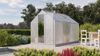 Das Gewächshaus-Einsteiger-Komplett-Paket!Sie suchen das perfekte Gewächshaus für Einsteiger? Ein rundum sorglos Komplettpaket? Dann ist das Gewächshaus Eos wahrscheinlich genau das richtige für Sie! Funktional und formschön fügt sich dieses Gewächshaus perfekt in den Hobbygarten ein. Mit Grundflächen von 3,1 bis 7,5 m ² ist das Eos auch reizvoll für fortgeschrittene Gärtner. Zum durchdachten Gesamtdesign zählen die konsequente Verglasung mit Hohlkammerplatten (HKP), die in zwei Stärken erhältlich ist, sowie die optisch ansprechenden, abgeflachten Designprofile. Durch diese hochwertigen Designprofile hebt sich das Eos spätestens auf den zweiten Blick von den meisten am Markt erhältlichen Einsteigermodellen ab. Die Hohlkammerplatten werden beim Aufbau einfach in die Profile eingeschoben und sind somit komplett eingefasst. Das macht das Eos im Gegensatz zur üblichen Verglasungstechnik mit Federklammern ganz besonders windstabil. Das Gewächshaus Eos ist gegenüber anderen Modellen ganz besonders lichtdurchlässig, denn es hat besonders breite Fensterfelder. Der insgesamt breitere Grundriss und eine Firsthöhe von über 2 m verleihen dem Eos ein besonders standfestes und großzügiges Aussehen. Auch die großzügige 1,36 m hohe Traufe und die 1,64 m hohe Tür, selbst in der kleinsten Version, sind keine Selbstverständlichkeiten unter den Einsteigermodellen. Bei der Eingangstür haben Sie die Freie Wahl, ob Sie sie als Schwing- oder als Schiebetür montieren. Die Tür ist mittels Vorhängeschloss abschließbar. Ein mitgelieferter Stahlfundamentrahmen für einen einfachen und standfesten Aufbau des Gewächshauses, sowie die inkludierten Regenrinnen komplettieren das Gesamtpaket des Einsteigermodells mit dem gewissen Extra. Gewächshausbausatz inklusive Stahlfundamentrahmen und der Streben zur Verankerung im Boden einfacher Aufbau Dank klammerloser Einschubtechnik besonders windstabil abgeflachte Designprofile breite Felder für mehr Lichteinfall eloxierte Aluminiumprofile sorgen für dauerhaften Schutz vor Korrosion Verglasung mit UV stabilisierten HKP stabile Befestigung der Hohlkammerplatten im Gewächshausrahmen durch längsseitig geschlossene Kanten Tür wahlweise als Schwing- oder Schiebetür montierbar Tür vorbereitet für Vorhängeschloss (nicht im Lieferumfang enthalten) inkl. 1 Dachfenster und Regenrinnen