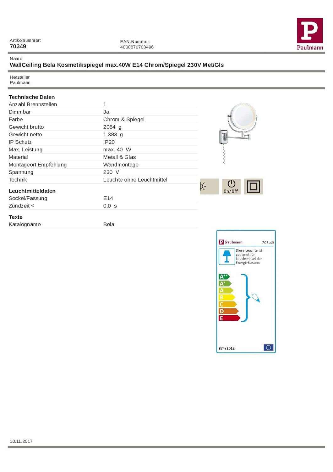 Der Paulmann WallCeiling Bela Kosmetikspiegel ist ein vielseitiger Begleiter für Ihr Badezimmer oder Schminktisch. Mit einer maximalen Leistung von 40 W und einer E14-Fassung bietet er sowohl eine normale als auch eine 3-fache Vergrößerung. Der Spiegel ist spritzwassergeschützt (IP44) und eignet sich somit ideal für Feuchträume. Dank des integrierten Schalters und des Spiralkabels ist er einfach zu bedienen, auch ohne Wandanschluss.