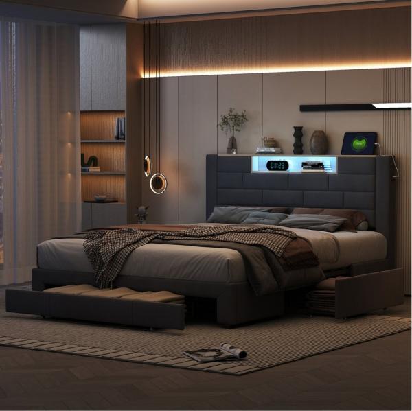 PXloue Polsterbett Doppelbett Stauraumbett Funktionbett, mit USB-Laden und Stauraum am Kopfteil,samt,140x200 cm
