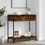 Dieser stilvolle Konsolentisch in Räuchereiche verleiht Ihrem Flur, Wohnzimmer oder Eingangsbereich einen Hauch von Eleganz. Hergestellt aus hochwertigem Holzwerkstoff, bietet er eine glatte Oberfläche, die sich durch Festigkeit, Stabilität und Feuchtigkeitsbeständigkeit auszeichnet. Mit reichlich Stauraum für Zeitschriften, Bücher und Dekoartikel sowie einem stabilen Metallrahmen ist dieser Tisch sowohl funktional als auch ästhetisch ansprechend.