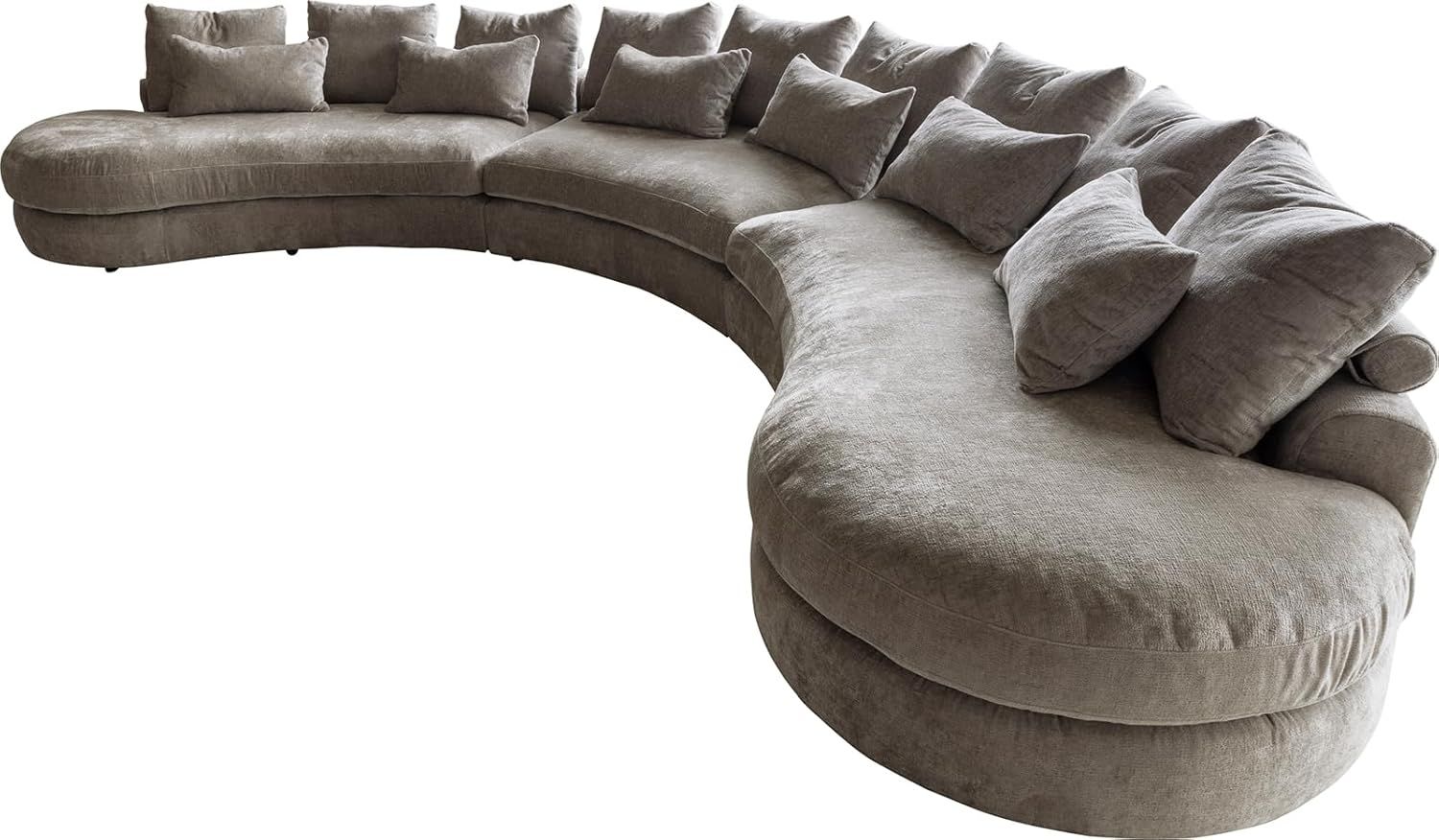 Das Megasofa Estrea in Taupe ist der perfekte Mittelpunkt für Ihr modernes Wohnzimmer. Mit großzügigen Maßen von ca. 505 x 252 x 92 cm und einem integrierten 3-Schicht Polsteraufbau bietet es höchsten Komfort. Der Bezug aus hochwertigem Webstoff (100% Polyester) und die schwarzen Füße verleihen dem Sofa eine stilvolle Note. Inklusive sind 15 Rückenkissen, bestehend aus 9 quadratischen und 6 rechteckigen Kissen.