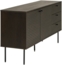 Dieses elegante Sideboard mit 3 Schubladen und 2 Türen bietet Ihnen nicht nur ausreichend Stauraum, sondern fügt sich auch harmonisch in verschiedene Wohnbereiche ein. Das geräucherte Eichenfurnier und die Beine aus schwarzem Metall verleihen dem Möbelstück eine moderne Note. Mit den kompakten Maßen von 150 x 40 x 74 cm ist es ideal für kleinere Räume geeignet.