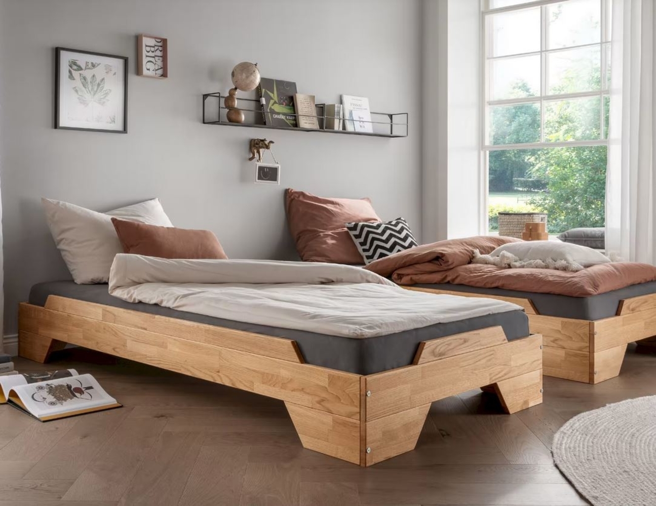 Entdecken Sie das 2er-Set Stapelbett "Pisa" aus massiver, geölter Wildeiche. Mit einer Liegefläche von 90x200 cm und einer stabilen Konstruktion bietet es optimalen Komfort. Die Maße betragen 95 cm in der Breite, 205 cm in der Länge und 30 cm in der Höhe. Die Einlegetiefe beträgt 15 cm, während die maximale Matratzenhöhe inkl. Lattenrost 21 cm nicht überschreiten sollte. Das Set wird zerlegt geliefert und lässt sich einfach zusammenbauen.