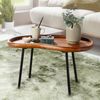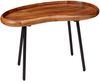 Design Couchtisch in angesagter Retro-Optik mit typischer Nierenform der 50er-Jahre. Stabile Metallbeine sorgen für festen Stand. Maße: B71 x H42 x T40 cm. Max. Belastbarkeit: 50 kg. Handgefertigtes Unikat aus Massivholz Sheesham und lackierten Eisenbeinen. Pflegeleichte Oberfläche mit Schutzlackversiegelung.