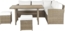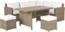 Gemütliches Lounge Set BARDI in Braun, ideal für Gartenfeiern und Zusammenkünfte. Das Set besteht aus einem L-förmigen Ecksofa, zwei Hockern und einem Esstisch. Die robuste Konstruktion aus Aluminium und PE-Rattan sorgt für Langlebigkeit. Die UV-beständigen Kissen mit abnehmbaren Bezügen bieten zusätzlichen Komfort. Maße: 201 x 177 x 74 cm, Sitzhöhe: 49 cm, Gewicht: 67 kg, max. Belastung Tisch: 45 kg, p.P.: 170 kg.