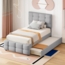 Das Polsterbett ist ein ausziehbares Kinderbett mit einem höhenverstellbaren Kopfteil und einer hautfreundlichen Leinenpolsterung in Grau. Mit den Maßen 90 x 200 cm bietet es sowohl Komfort als auch Funktionalität. Das Bett verfügt über ein zusätzliches ausziehbares Bett, das bei Bedarf als separates Bett genutzt werden kann. Die stabile Stützstruktur sorgt für ein sicheres Schlafgefühl.