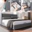 Dieses elegante Polsterbett in der Größe 180x200 cm vereint modernes Design mit hohem Komfort und Funktionalität. Das verstellbare Wingback-Kopfteil bietet dreifache Neigungsoptionen für optimale Unterstützung beim Lesen oder Entspannen. Unter dem Lattenrost befindet sich ein großzügiger, hydraulisch öffnender Stauraum für Decken und Kissen. Die strapazierfähige Konstruktion aus Massivholz, Leinen und Metall sorgt für Stabilität und Langlebigkeit.