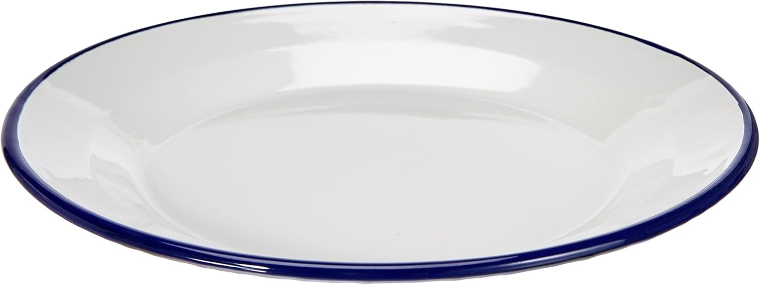 Teller flach aus der Email-Serie HUSUM. Farbausführung: innen und außen weiß mit blauem Rand. Vielseitig verwendbar, leicht und mühelos zu reinigen. Maße (L x B x H): 24 x 24 x 3 cm.