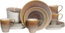 Das Caldera Sand Kombiservice ist ein 16-teiliges Designer-Geschirr, das Ihren Tisch stilvoll schmückt. Es umfasst 4 Speiseteller mit einem Durchmesser von 27 cm, 4 Dessertteller mit 21 cm, 4 Kaffeebecher mit einem Fassungsvermögen von 30 cl und 4 Mehrzweckschalen mit einem Durchmesser von 16 cm. Die markante Optik entsteht durch mehrere übereinander liegende Glasuren in intensivem Grün und strahlend weißen Außenseiten. Das Geschirr ist spülmaschinen- und mikrowellengeeignet.