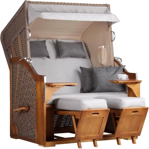 Der Strandkorb Schleswig Pinie in Mokka Braun mit Dessin 559 bietet Ihnen einen stilvollen Rückzugsort im Freien. Hergestellt aus hochwertigem Pinien Vollholz und witterungsbeständigem PE-Geflecht, vereint er Robustheit mit ansprechendem Design. Die extra dicken Sitz- und Fußkissen sowie die zwei Wurf- und Nackenkissen sorgen für höchsten Komfort. Mit zwei einschiebbaren Fußbänken und schwenkbaren Bistrotischen genießen Sie zusätzlichen Komfort und Ablagefläche. Die abnehmbaren und waschbaren Bezüge aus Polyester erleichtern die Pflege.