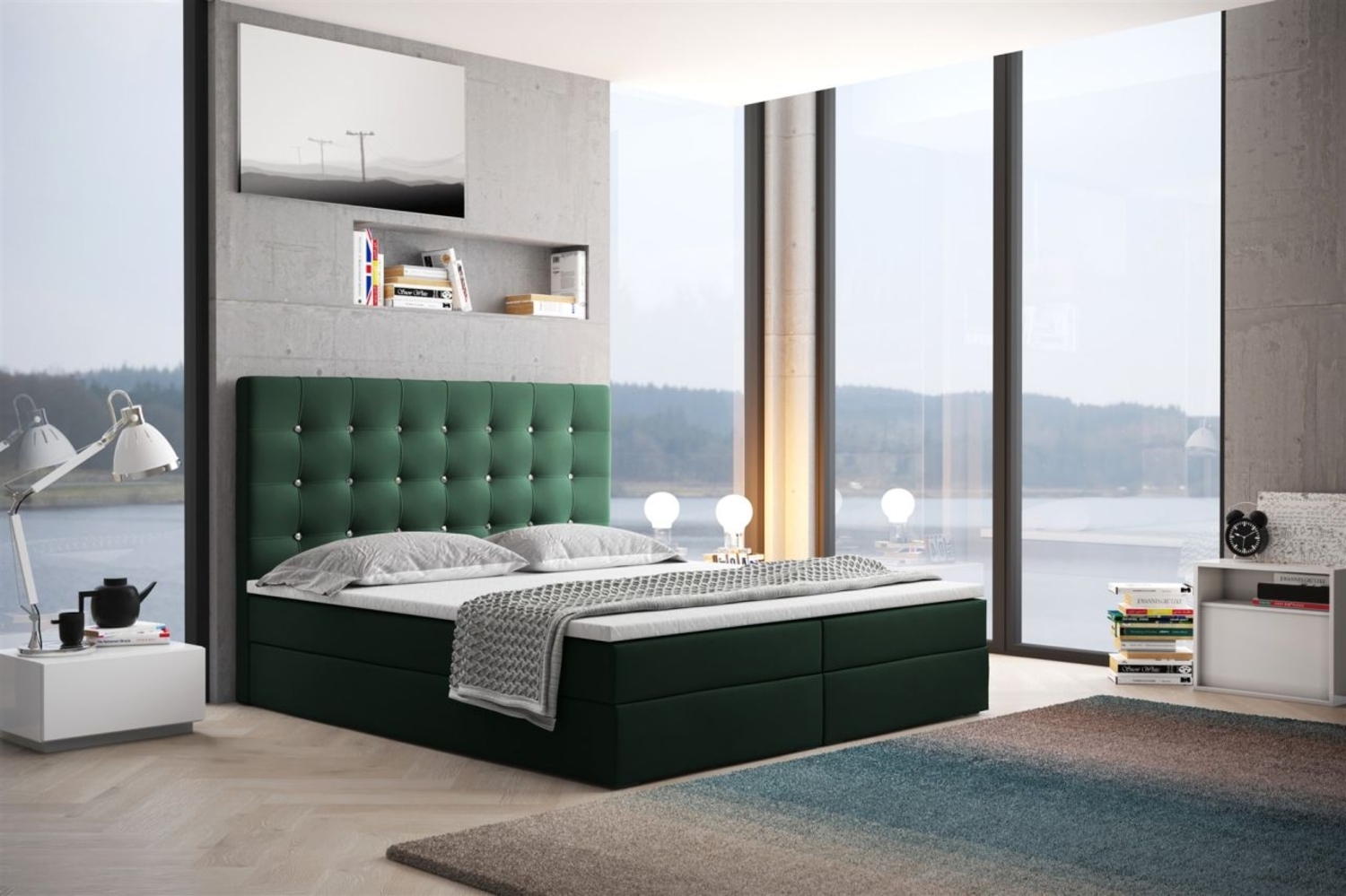" Boxspringbett Schlafzimmerbett TRIANA 180x200 cm Stoff (Riviera) Grün inkl. 2 x Bettkasten Boxspringbett/Polsterbett TRIANA mit aufklappbaren Bettkästen Das extravagante Boxspringbett TRIANA besticht durch das ausgefallene Design. Die Bettkästen sind gepolstert und mit markanten Rundungen versehen, was dem Boxspringbett Einzigartigkeit und Luxuriösität verleiht. Der Topper aus Viscoschaum passt sich dem Körper an und sorgt dadurch für einen hohen Schlafkomfort. Außerdem bietet das Boxspringbett ausreichend Stauraum für alltägliche und nicht alltägliche Dinge. Besonderheiten: Beidseitig aufklappbare Bettkästen Strasssteine im Kopfteil Hochwertige Taschenfederkernmatratze mit orthopädischen Eigenschaften Hypoallergener Topperbezug Widerstandsfähiger und angenehm zu berührender Stoff oder Kunstleder Gepolstertes Kopfteil und gepolsterte Bettkästen Hochwertige Viscoschaum Topper Material: Topper: 5 cm Viscoschaum Der Bezug des Viscotopper ist abnehmbar Matratze: 18 cm Taschenfederkernmatratze / H3 Unterkonstruktion: stabiles Holzgrundgestell