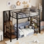 Hochbett 90x200 cm Kinderbett aus Schmiedeeisen mit Leiter, Regalen & Kleiderschrank, stabil, platzsparend, schwarz