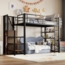 Dieses Hochbett aus Schmiedeeisen bietet eine sichere und funktionale Lösung für Kinder- und Jugendzimmer. Mit einer Liegefläche von 90x200 cm und einer Gesamtgröße von 255 x 98 x 170,5 cm maximiert es den Raum und schafft Platz für einen Arbeitsplatz oder Stauraum. Die stabile Leiter mit rutschfesten Stufen und der hohe Zaun sorgen für Sicherheit. Integrierte Regale und ein Kleiderschrank bieten zusätzlichen Stauraum. Das elegante schwarze Design passt zu verschiedenen Einrichtungsstilen.