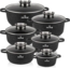 Das Zilner Topf-Set besteht aus sechs eleganten grauen Töpfen mit einer steinüberzogenen Granitbeschichtung. Hergestellt aus hochwertigem Aluminiumguss, bietet es eine hervorragende Wärmeleitung und ist für alle Herdarten geeignet. Mit einem Volumen von 1,3 L, 2,3 L, 2,3 L, 3,2 L, 4,5 L und 6,8 L ist es ideal für die Zubereitung gesunder Gerichte. Die Töpfe sind kratzfest, korrosionsbeständig und leicht zu reinigen.