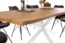 Der Esstisch Josy vereint stilvolles Design mit Funktionalität. Die 40 mm starke Tischplatte aus MDF in Wildeiche-Optik mit gefräster Baumkante bringt natürliche Eleganz in Ihr Zuhause. Das weiße Spider-Gestell aus Metall sorgt für Stabilität und eine moderne Ästhetik. Mit den Maßen von 220 x 100 cm ist der Tisch vielseitig einsetzbar, sei es als Ess- oder Arbeitstisch.