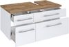 Der Waschbeckenunterschrank 'Davos' in Weiß-Wotan Eiche vereint modernes Design mit praktischer Funktionalität. Die Front aus matt weißem MDF und der Korpus aus melaminharzbeschichteter Spanplatte sorgen für eine ansprechende Optik und Langlebigkeit. Mit einem kleinen und einem großen Schubkasten sowie zwei Auszügen mit Softclose-Funktion bietet er ausreichend Stauraum. Der Siphonausschnitt auf der rechten Seite ermöglicht eine einfache Installation.