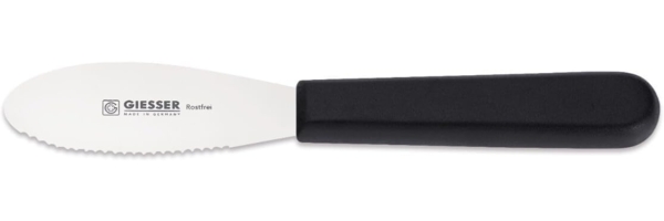 Das Giesser Buttermesser 8795 ist ideal zum Streichen und überzeugt durch seine hochwertige, matt polierte Klinge aus Chrom-Molybdän-Stahl. Mit einer Härte von 56-57 Rockwell, die im Vakuumverfahren erreicht wurde, bietet es optimale Rostbeständigkeit und Langlebigkeit. Die halbflexible Klinge und der rutschfeste Kunststoffgriff (TPE, Farbe Schwarz) sorgen für eine angenehme Handhabung und höchste Qualität.