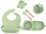 Olivgrünes 6-teiliges Silikon-Geschirrset für Kinder, bestehend aus einer Babynahrungsschüssel, einem Teller, einem Strohhalm und einem Becher. Das Set ist aus lebensmittelechtem Silikon gefertigt und bietet eine Hitzebeständigkeit von -20 °C bis 220 °C. Es ist stoßfest, leicht zu reinigen und ideal für den täglichen Gebrauch.