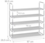 Übersichtliches Schuhregal für bis zu 20 Paar Schuhe mit 5 Ebenen. Die Kombination aus pulverbeschichtetem Metall und robustem Vlies in Weiß sorgt für Stabilität und Langlebigkeit. Mit den Maßen 90,5 x 87 x 29,5 cm und zwei zusätzlichen Ablageflächen in Honigbraun (33,5 x 69,5 x 26 cm) bietet es viel Stauraum. Die Montage erfolgt einfach und schnell durch ein praktisches Stecksystem.
