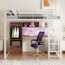 Hochbett aus Metall mit LED-Leuchten, einem integrierten Schreibtisch, einer Schublade und Regalen. Das Bett hat die Maße 140 x 200 cm und bietet durch seine Konstruktion aus Eisen und MDF eine hohe Tragfähigkeit. Die LED-Beleuchtung ermöglicht die Auswahl aus 16 Farben und schafft eine angenehme Atmosphäre. Mit einem Gewicht von bis zu 150 kg ist es ideal für verschiedene Nutzungsmöglichkeiten.
