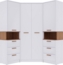 Das Marmex Möbel Grant 17N Garderoben-Set bietet eine praktische Lösung für Flur, Schlafzimmer oder Kinderzimmer. Das Set besteht aus einem zweitürigen Eckschrank mit zwei Kleiderstangen und Einlegeböden sowie zwei Standregalen, die jeweils drei Schubladen und offene Fächer bieten. Die Möbel sind aus laminierter Spanplatte gefertigt und in einer ansprechenden Kombination aus Weiß und Riviera Eiche gehalten.