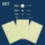 - Fluoreszierende Leuchtpunkte in 3 Größen: 28 Punkte (Ø 22 mm), 132 Punkte (Ø 13 mm), 210 Punkte (Ø 9 mm) und 154 Mikroquadrate (4 x 4 mm)