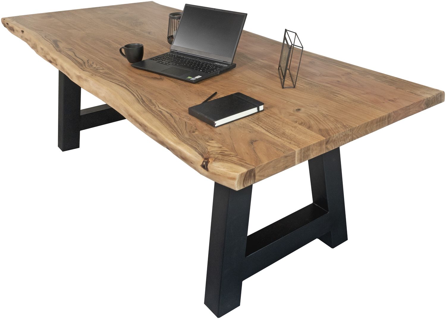 Trendiger Esszimmertisch Cali, 280 x 100 cm, Akazienholz massiv & naturfarben, A-Gestell Schwarz: Aufgedoppelte Tischplatte – Die Tischplatte wurde an den Kanten auf 50 mm (25 + 25 mm) aufgedoppelt. Eine aufgedoppelte Platte hat den Vorteil, dass sie wesentlich leichter ist als normale Platten. Natur Pur – Besonderes Highlight des Esszimmertisches sind die Tischkanten, die den natürlichen Formen eines Baumes entsprechen und direkt aus dem Baumstamm geschnitten wurden. Da der Tisch ein reines Naturprodukt ist, kann es zu Astlöchern oder unterschiedlichen Farbnuancen kommen. Hochwertiges Unikat – Der Esstisch besteht aus massiven und robusten Akazienholz. Aufgrund der einzigartigen Maserung erhalten Sie ein Unikat mit individuellem Charakter. Das A-förmige Gestell sorgt für einen gelungenen Kontrast, welcher dem Massivholztisch einen Hauch von industriellem Look verleiht. Ausgezeichnete Verarbeitung – Die gesamte Verarbeitung dieses charismatischen und edlen Naturholzes ist sehr schonend sowie naturgerecht, wodurch die Möbel atmungsaktiv bleiben und eine gesunde Wohlfühl-Atmosphäre schaffen. Vielseitig einsetzbar – Der Küchentisch strahlt mit seiner rustikalen Art eine Gemütlichkeit aus, die Ihre Essecke warm und wohnlich wirken lässt. Durch die trendigen Baumkanten entsteht eine edle Note in Ihrem Esszimmer. Der Tisch mit stilgerechten Stühlen kombiniert, kreiert ein großartiges Ensemble für Ihr Zuhause. Nutzbar für wieviele Personen? – Der Baumkantentisch ist gut geeignet für 8-12 Personen, je nach Stuhlbreite. Maßangaben: : Gesamtlänge: ca. 280 cm Gesamtbreite: ca. 100 cm Gesamthöhe: ca. 77 cm Materialstärke: ca. 5,0 cm (2,5 + 2,5 cm); : ,